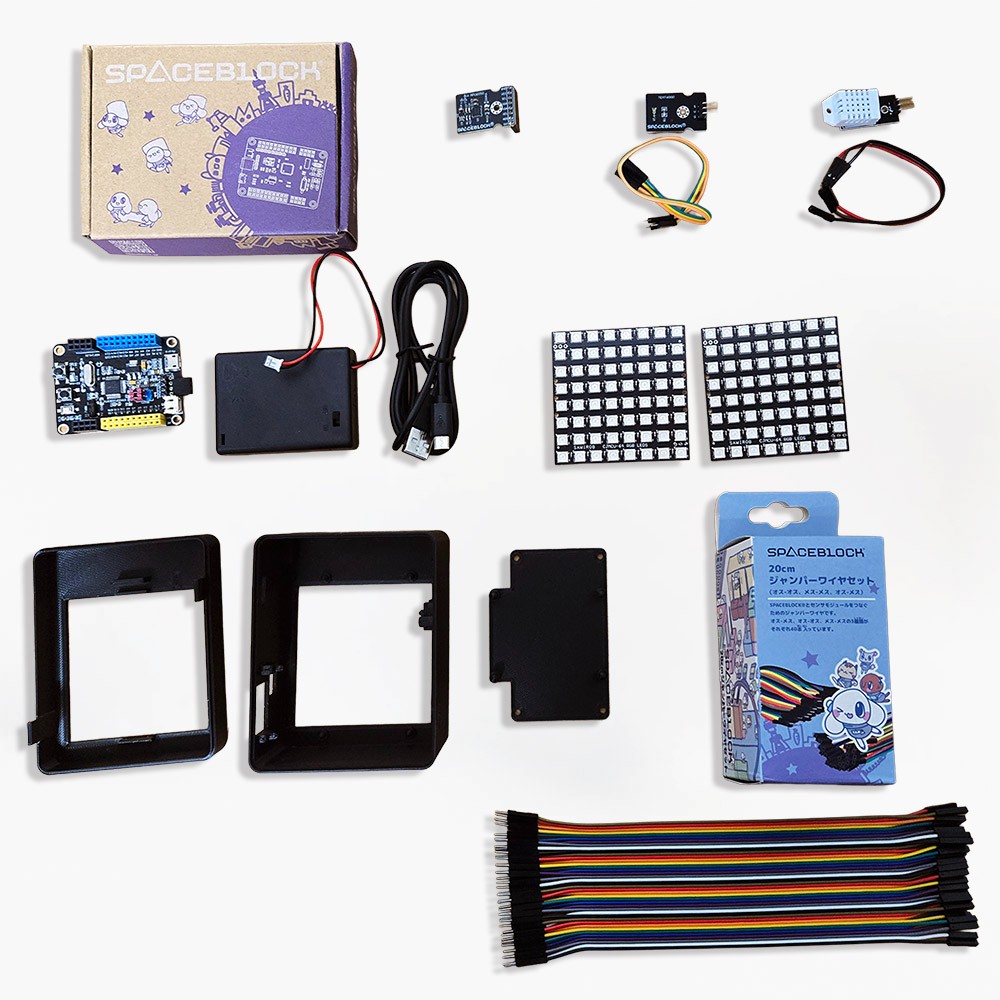 届いてすぐに始められるように、SPACEBLOCK専用のマイコンボードやUSBケーブルなどがセットになった基本セットです。